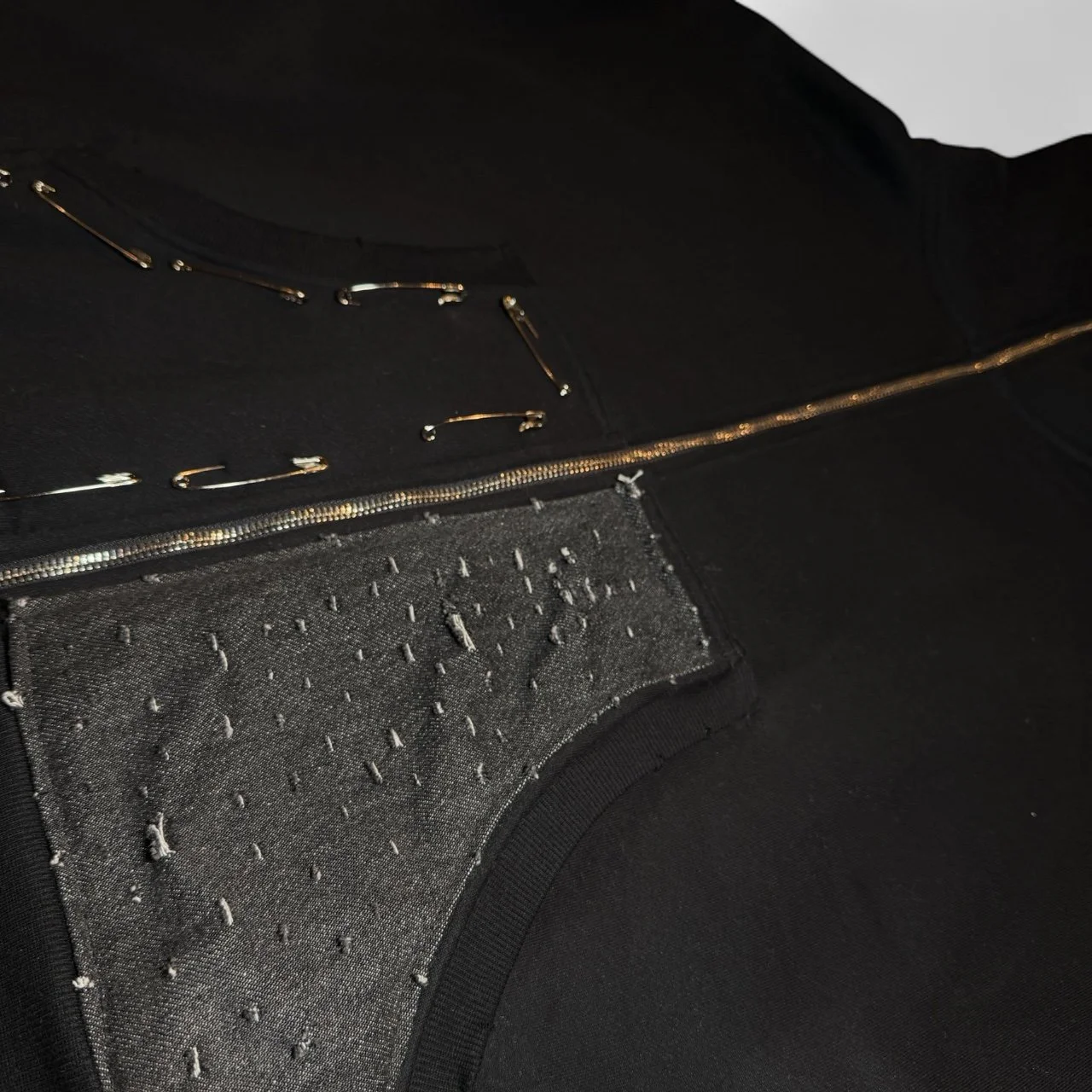 Lace veils the edges of confession. A safety-pinned cross sits at the throat; lace panels fall down the front like a quiet liturgy. The back exposes skin through a lace and denim cross- a tension between concealment and revelation.