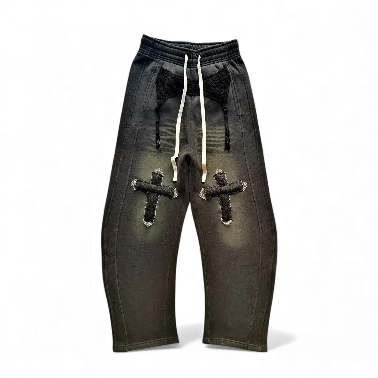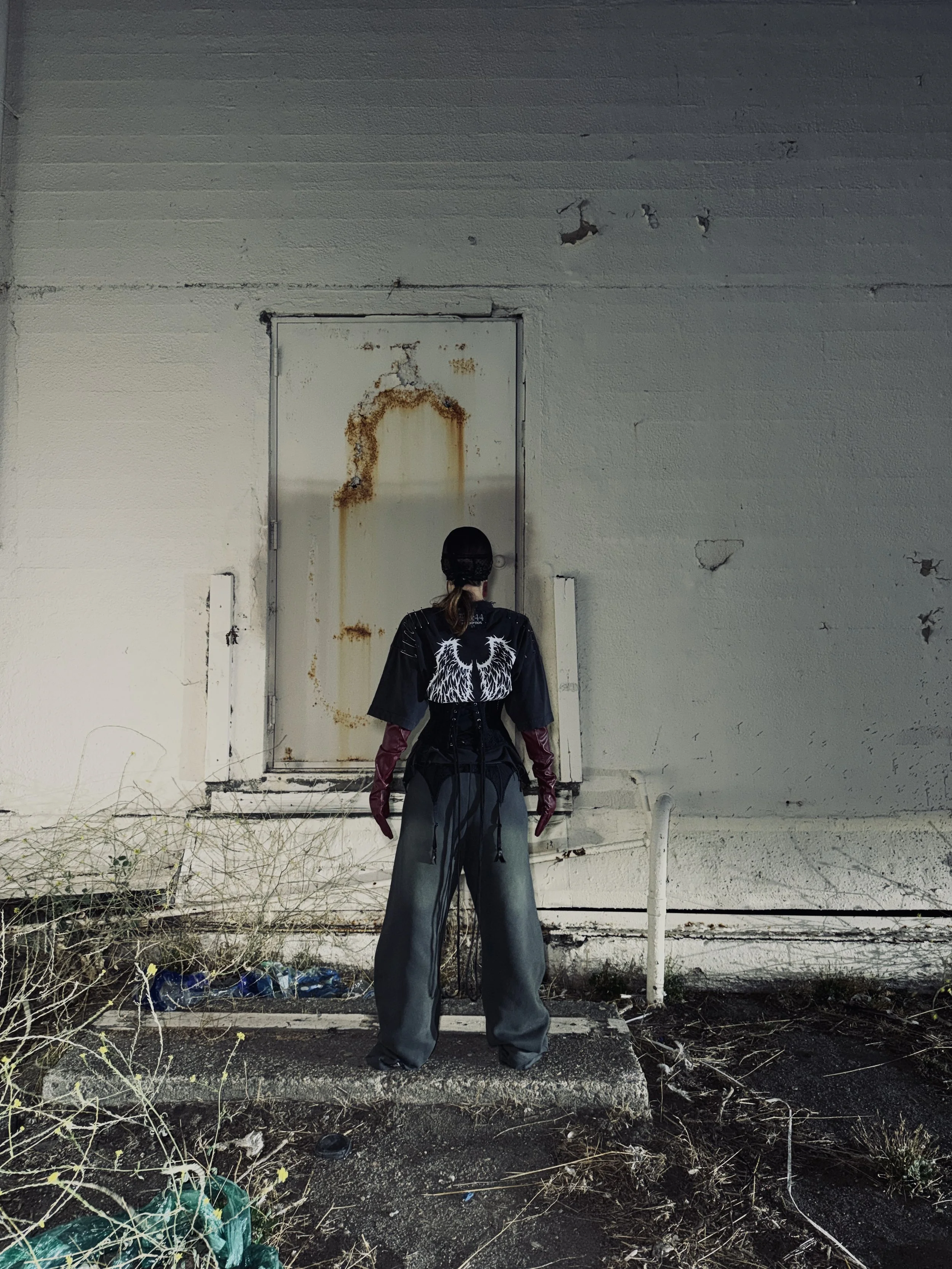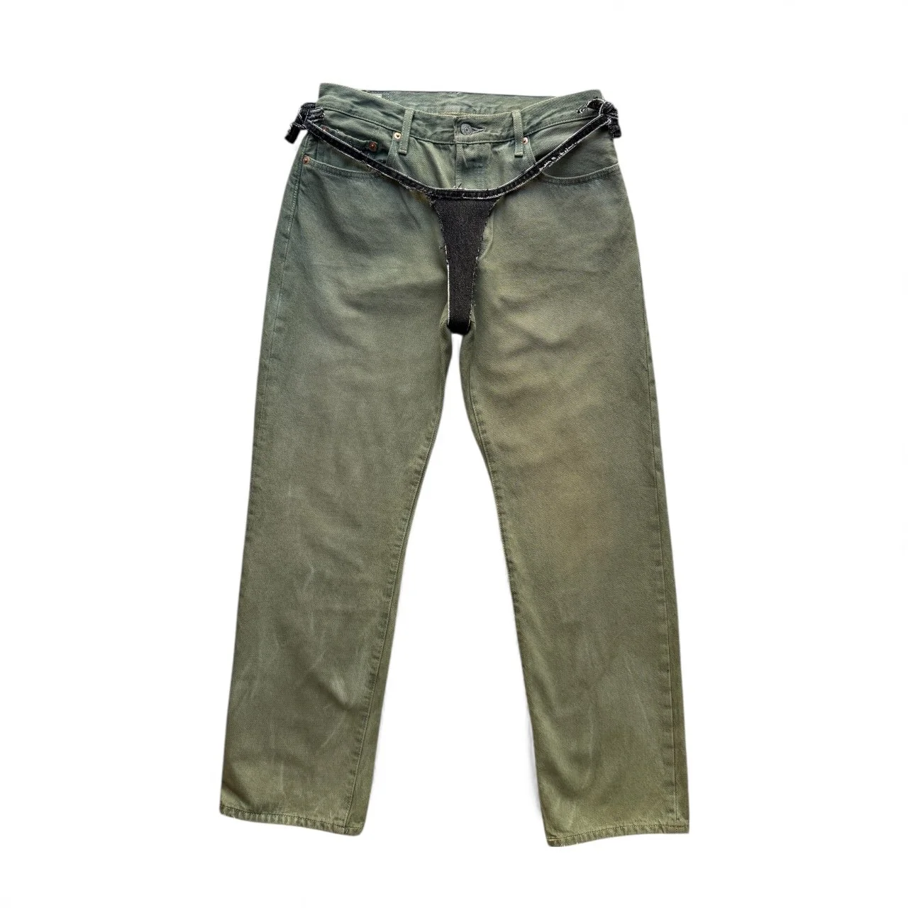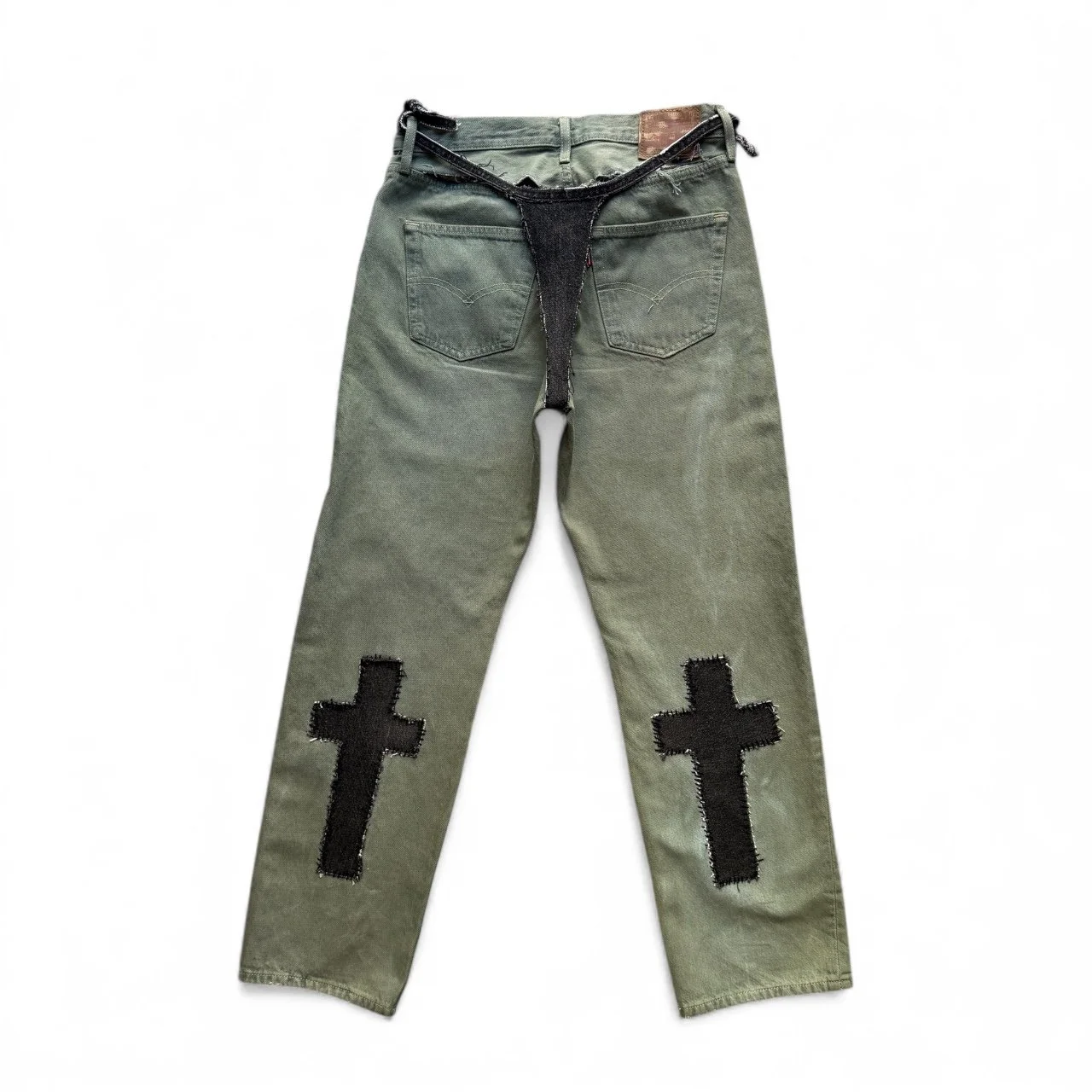 A relic of restraint and renewal. Hand-dyed in muted olive and lavender tones, the denim carries a quiet gradient of transformation. A brass chain anchors the waist; a lace-bound cross rests on the thigh- devotion stitched into decay. Lace distressing across the back reveals a gentler rebellion beneath.