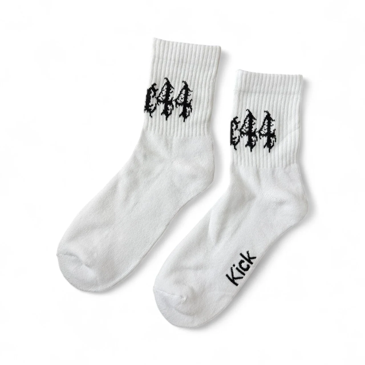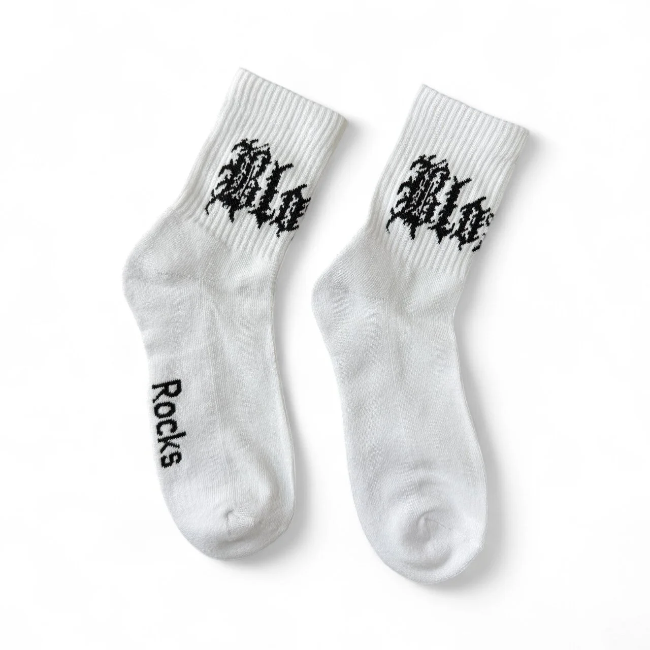 Black ribbed crew socks. SECRET STASH print on soles. Nothing to see until you kick back.